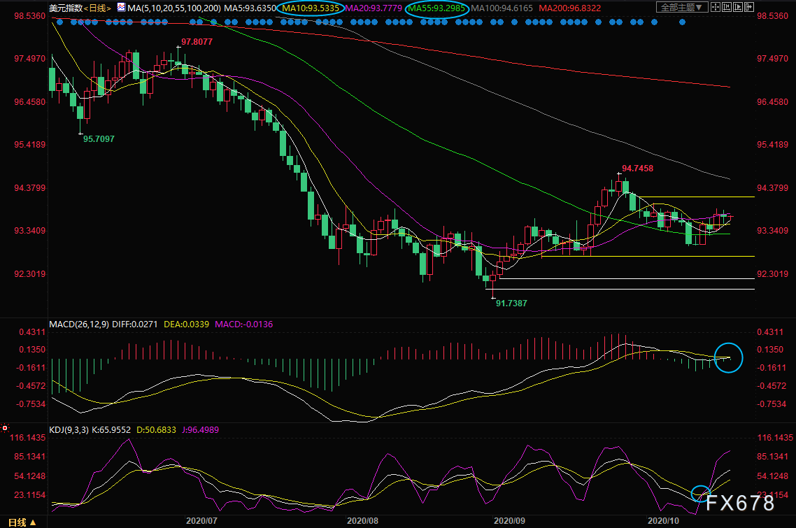 10日均线支撑目前在93.54附近,55日均线支撑在93.30附近,若回落至该位置下方,则破坏短线看涨信号。