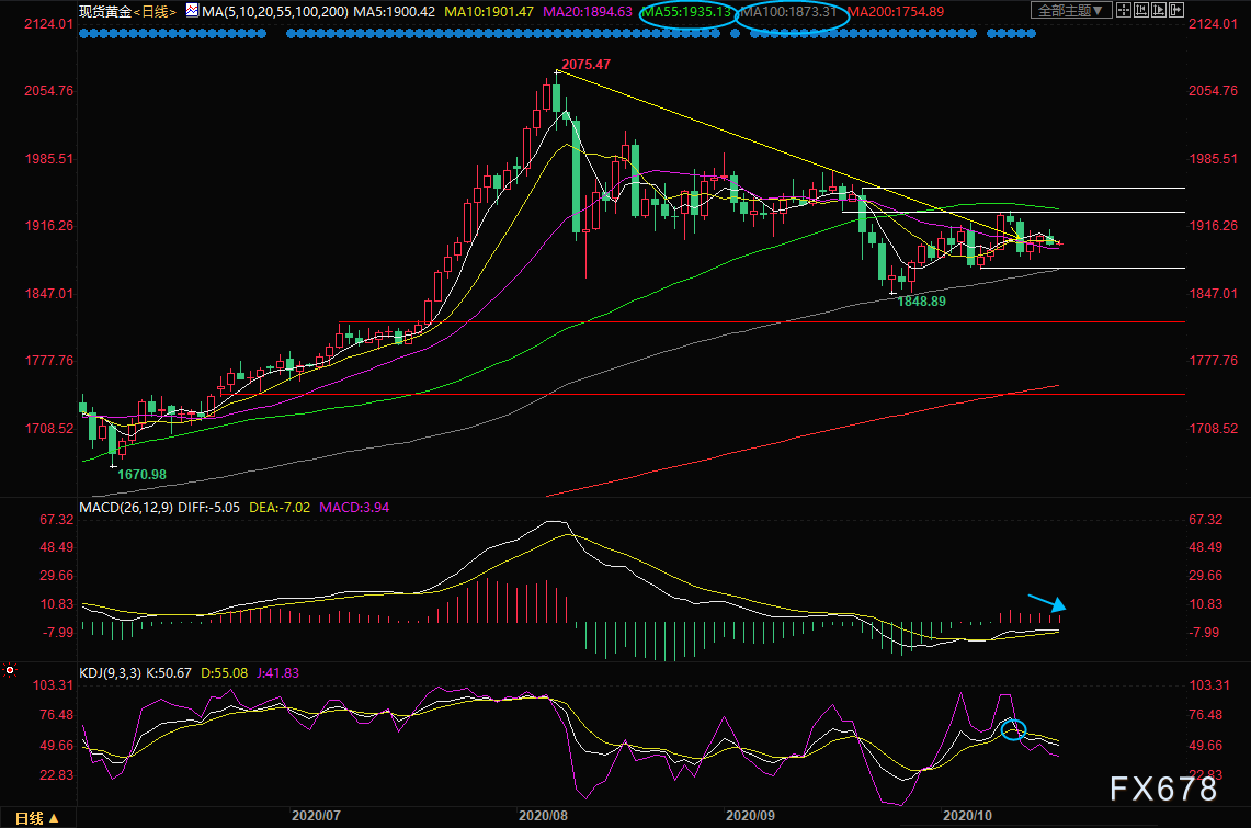 上方初步阻力在上周五高点1914.06附近,55日均线阻力在1935.13附近,若能顶破该阻力,则增加短线看涨信号。
