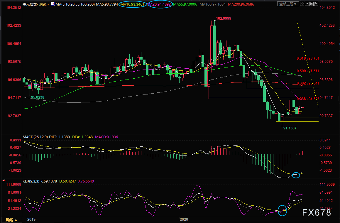 下方10周均线支撑在93.35附近,若回落至该位置下方,则削弱短线看涨信号。