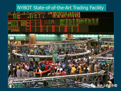 纽约期货交易所的总部在纽约世贸中心3号楼(3 WTC)。作者曾于2001年去NYBOT拜会交易所同行,并参观了交易大厅。“9/11”事件后,3号楼损坏严重,NYBOT迁往附近的国际金融中心(WFC)并与纽约商品交易所(NYMEX)共用同一个交易大厅。