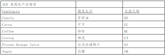 以下是ICE US目前上市的主要农产品期货和期权合约: