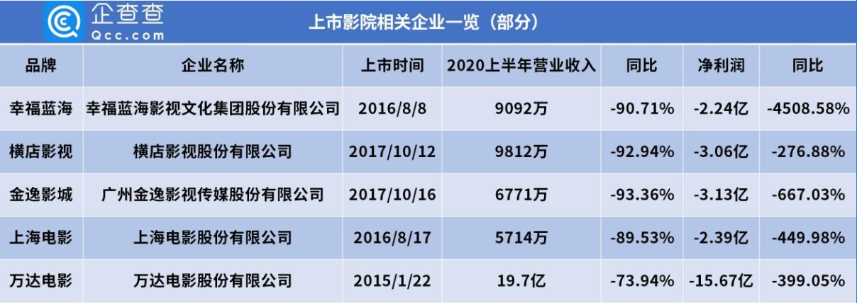 企查查整理了部分头部上市影院企业2020年上半年营业收入情况,发现同比下降70%甚至更多是普遍现象。其中,金逸影城上半年的营收为6771万,同比下降了93.36%。而万达电影上半年营收达19.7亿,同比下降了73.94%。从净利润上来看,幸福蓝海、横店影视、金逸影城以及万达电影等上市影院企业的净利润均呈负增长,其中幸福蓝海上半年净利润同比下降幅度最大,同比下降4508.58%,净利润为负的2.24亿。