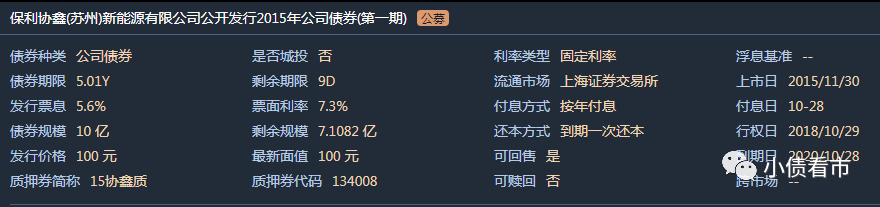 《小债看市》统计,目前保利协鑫(苏州)仅存续“15协鑫债”这一只债券,当前余额7.11亿元,票息7.3%,期限5年,将于本月28日到期。