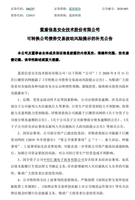 或许是担心效果不够好,8月12日,蓝盾股份再发补充公告,表示自己出现债务逾期、涉及诉讼及部分子公司被列入失信被执行人等事项,日常生产经营受到较大不利影响,偿债能力及盈利能力受到削弱。