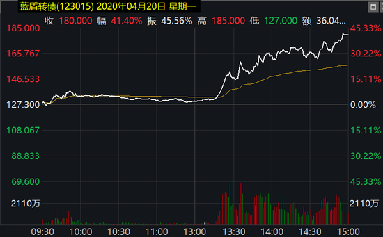 比如,今年4月,蓝盾转债一度连续大涨,4月20日这一天就涨超40%。