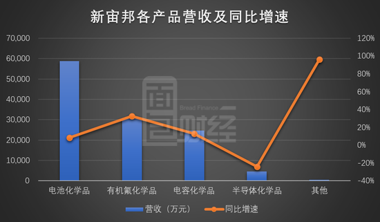 2020年上半年,新宙邦实现营收119337.88万元,同比增长12.94%。其中,电池化学品、有机氟化学品、电容化学品、半导体化学品业务的营收占比分别为49.30%、25.87%、20.62%和3.88%。