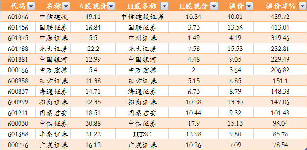 作为A股第14家“A+H”上市券商,数据显示,截至10月19日,券商板块目前13只AH股平均溢价率为20.3%,其中中信建投、国联证券溢价率最高,分别为439.72%和413.04%,中原证券、光大证券、中国银河、申万宏源溢价率等超过200%。