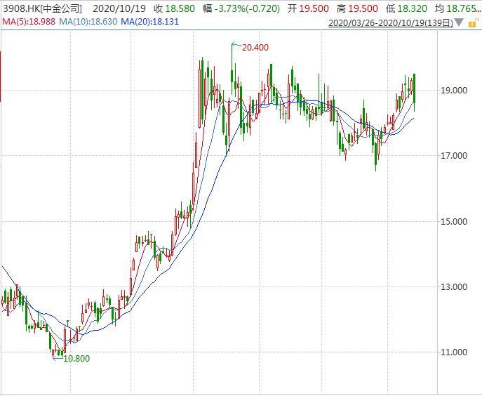 WIND行情显示,中金公司(3908.HK)最新报18.58港元,动态市盈率为13.8倍。9月底以来公司股价小幅上涨,10月份累计涨幅约4%。