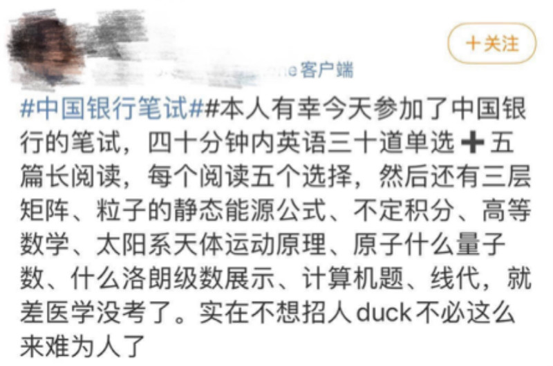 最早登上热搜的中国银行笔试分为亚洲、澳洲两个场次,考试内容涉及洛朗级数展式、卷积神经网络、DES加密算法、天体运动、卡方检验、粒子静态能源公式、《凡尔赛和约》、机械图纸、现代主义诗人等多学科领域知识。考生们甚至抱怨,不想招人也不必如此难为人。