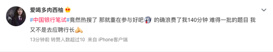 不过,10月15日,邮储银行校招笔试试题“并没有太多槽点”。有考生在评论区调侃道,“邮储看来你真得反思一下,我连着做了这么多天银行考试,怎么就你没上热搜?”