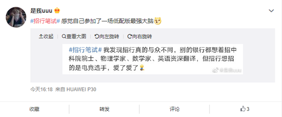 据了解,招行笔试在线上进行。从网友的反馈来看,考试的内容包括英语和……小游戏……其中,网友提到的小游戏有“点星星”“追踪小球”以及“找不同”,等等。
