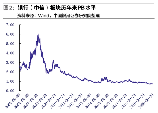 从持仓来看,机构持仓已经接近历史底部。2020年二季度,公募基金银行股重仓比例仅为2.4%,创2015年以来持仓比例新低,历史上也仅高于2014年三季度的2.0%。