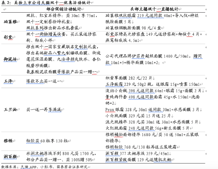 美妆用品一直是“双十一”活动的重头戏,国泰君安零售团队也对该部分进行了分析:大多数美妆品牌“双十一”期间在考虑买赠活动以及跨店满减活动以后,促销力度均在5折以下,最低活动力度在3.5折左右。除了价格和赠品优惠,珀莱雅、彩棠,御家汇旗下伊菲丹、玉泽、润百颜等品牌还争取到了淘宝头部主播薇娅和李佳琦的直播支持,在“双十一”期间对明星产品进行直播推广,促进销售量进一步爆发。