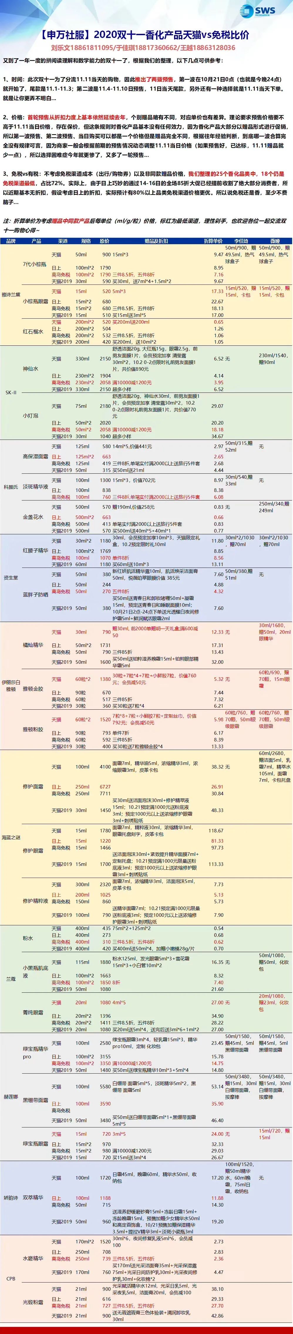 价格方面,申万宏源社服研究团队认为,首轮预售折扣力度也基本延续去年,个別赠品略有不同,对应单价也有差异。据了解,预售价格要不高于11月11日当日价格,存在保价,但这条规则对香化产品基本没有任何效力,因为香化产品大部分以赠品形式进行促销,所以第一波预售、第二波预售、当日购买都是一个价格,但是赠品完全不同,根据往年经验判断,到底哪一波划算完全没有规律可言。