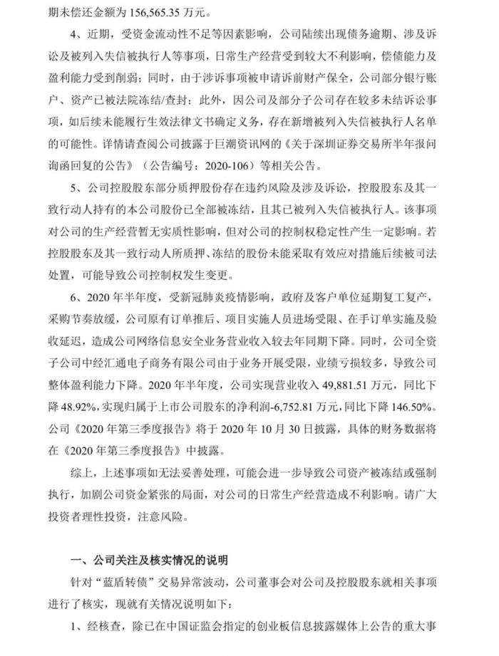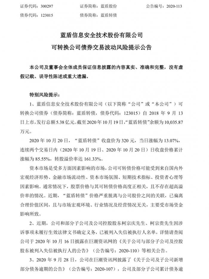 与此同时,蓝盾转债(123015)10月19日经历了两次熔断,当晚蓝盾股份发布公告,提示投资者理性投资。