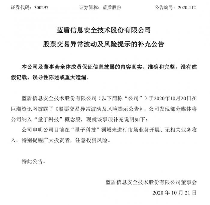 10月20日晚间,蓝盾股份(300297)发布公告称,近期,公司发现部分媒体将公司纳入“量子科技”概念股,公司申明公司目前在“量子科技”领域未进行市场业务开展、无相关业务收入。