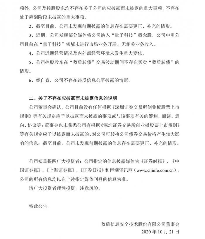 原标题:股债涨个不停!蓝盾股份再发公告降温:没有量子科技、没有相关收入
