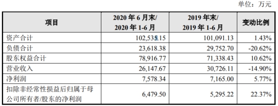 2020年1-6月,帅丰电器实现营业收入为2.61亿元,同比下降14.90%;净利润为7578.34万元,同比增长5.77%;扣除非经常性损益后归属于母公司股东的净利润6479.50万元,同比增长22.37%。