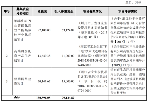 帅丰电器此次募集资金总额为8.55亿元,扣除发行费用后,募集资金净额为7.91亿元,其中,5.31亿元用于年新增40万台智能化高效节能集成灶产业化示范项目、1.10亿元用于高端厨房配套产品生产线项目、1.50亿元用于营销网络建设项目。