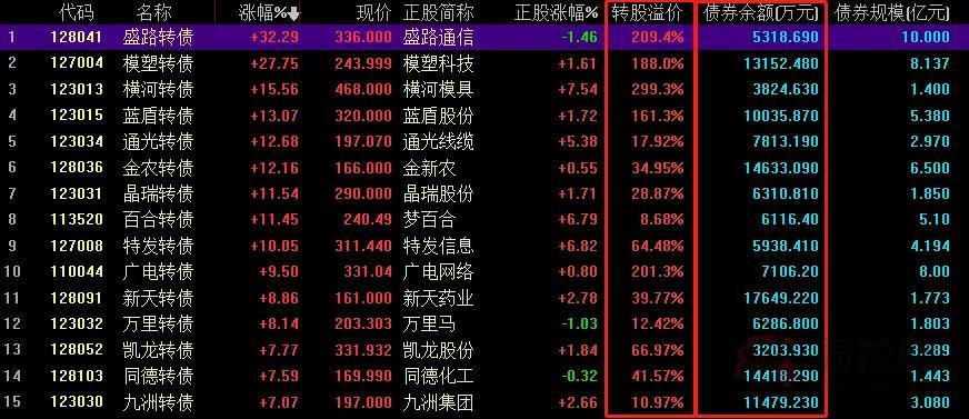 从20日涨幅前十五的转债来看,多只转债都在300元以上。债券剩余规模也都集中在1亿元左右,其中,涨幅第一的盛路转债剩余规模仅5000多亿。转股溢价率方面,15只转债中有多只高于50%,最高的横河转债达到近300%的溢价率。