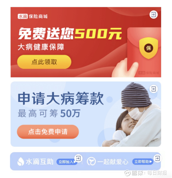推荐自家保险的页面,点击之后会跳转到购买某保险的页面。因为水滴筹众筹的是因为没钱看病的人群,所以这时转化率就会比较高,平台就能从中收取管理费和抽成。