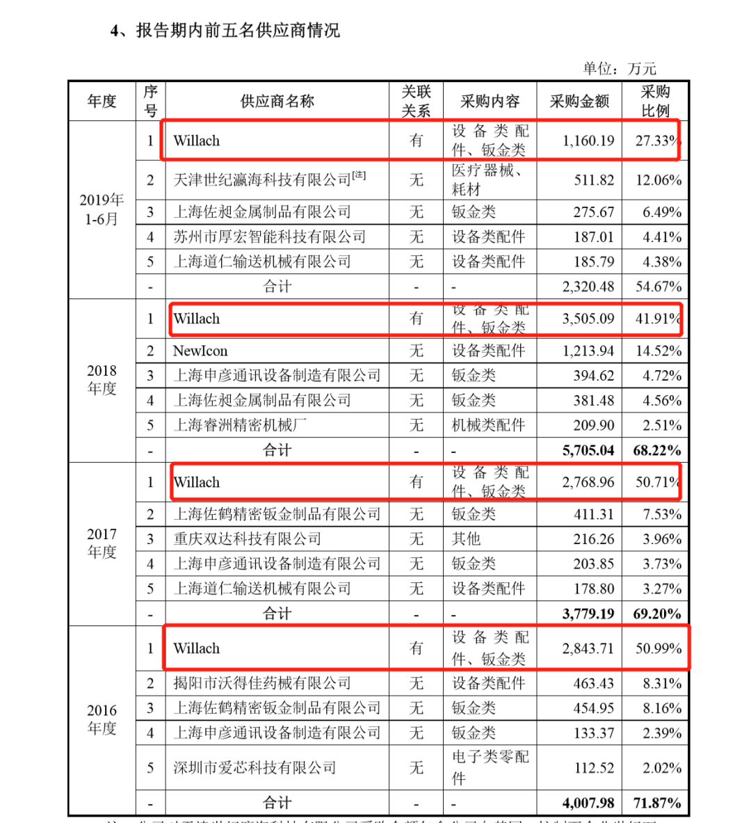 据健麾信息招股书(申报稿)显示,2016年至2018年,Willach一直名列其各期供应商采购首位,采购金额分别达到2843.71万元、2768.96万元、3505.09万元,占当期采购比例分别为50.99%、50.71%、41.91%。