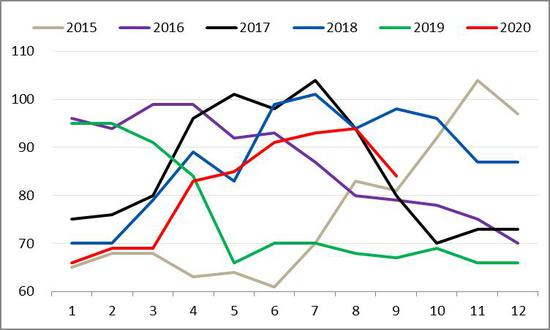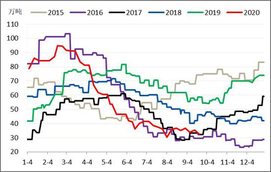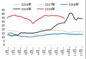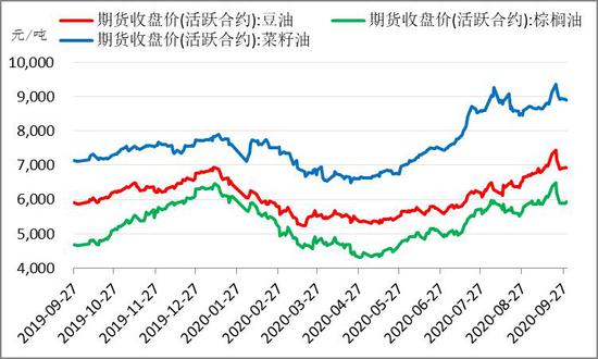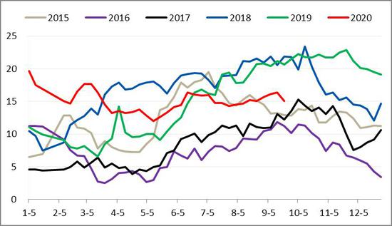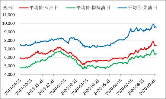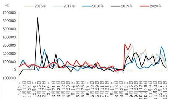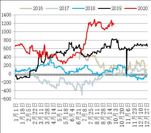 随着中秋及国庆双节临近,油厂压榨正常,也使得豆油库存增长缓慢,截止2020年9月28日当周,国内豆油商业库存总量134.65万吨,较前一周的133.09万吨增1.56万吨,增幅为1.2%,较上个月同期130.75万吨增3.9万吨,增幅为3.01%,较去年同期的132.5万吨降2.15万吨,降幅0.87%,五年同期均值136.32万吨。豆油累库存的压力逐渐显现。