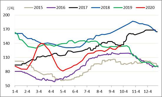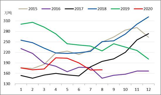从海关数据看棕榈油进口:2020年7月,我国进口棕榈油496544.315吨,较上月的581133.624吨减少84589.309吨,降幅为14.56%,2020年1-7月棕榈油进口3066473.203吨,较去年同期的3819661.506吨下降621845.712吨,降幅19.48%。国内进口棕油减少,在库存方面得到体现。从季节性看,趋势没有异常。