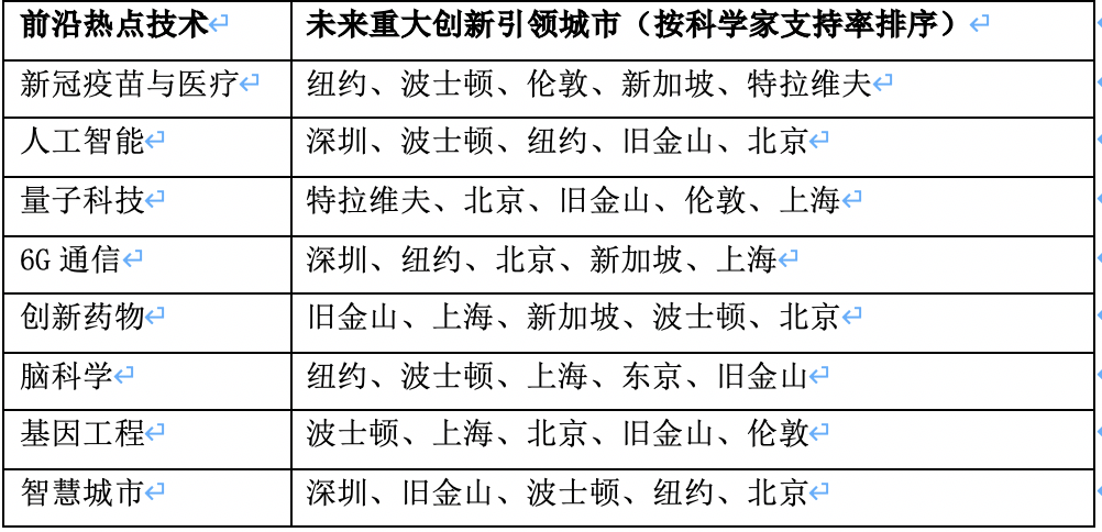 科学家对于未来15年内最有可能率先涌现重大创新突破的城市的预测。