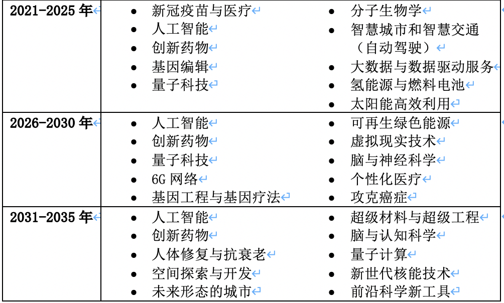 本次调查中全球科学家对未来5年、10年和15年中,可能引领世界创新热点的关键科技进行了预测,凝练形成了2025年、2030年和2035年的全球10大热点科技清单。