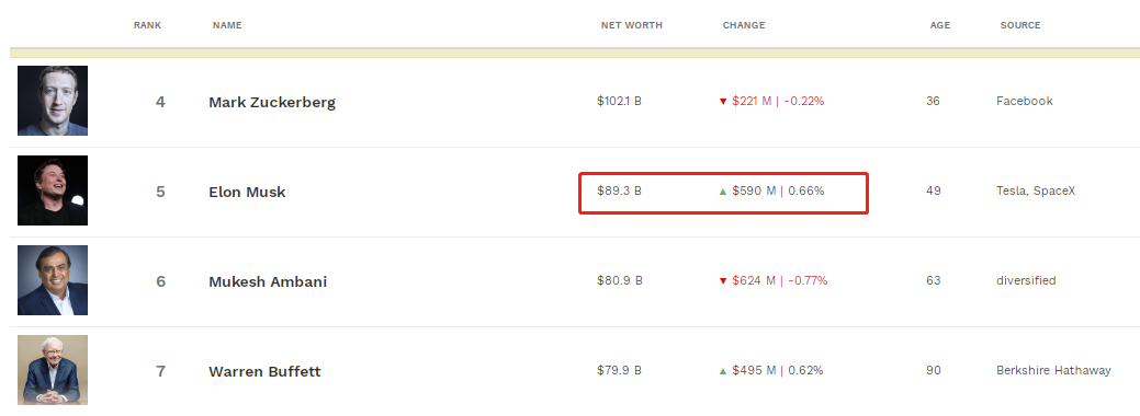 福布斯实时富豪榜显示,马斯克最新身家达893亿美元,超过印度首富穆凯什·安巴尼和“股神”巴菲特,较前一日增长5.9亿美元(约合人民币39亿元)。