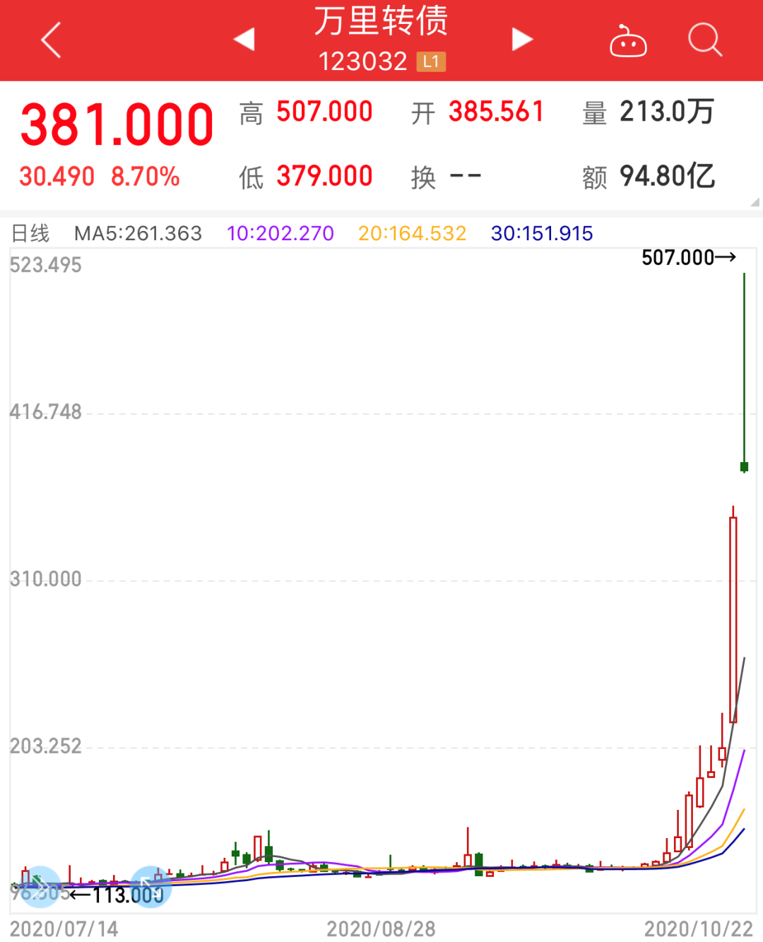 近两日,万里转债涨幅已超过一倍,价格从20日收盘的203元,盘中一度逼近500元关口,溢价率已经超过了100%,其转股值为194.63元,目前价格已经偏离了公司的估值。