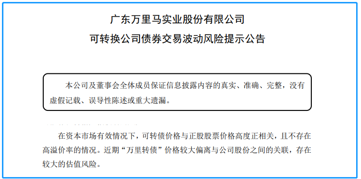 10月21日晚,万里马公告称,万里转债自10月1日至本公告披露日累计涨幅为171.11%,转股溢价率达86.78%,均处于较高水平。依据相关规则,可转债交易不设置涨跌幅限制,可能存在价格大幅波动的风险。