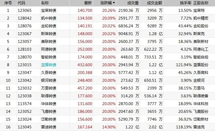 今天早间一开盘,又有多只可转债开盘后大涨,行情延续“火爆”,凯中转债、同德转债、万里转债、蓝盾转债等15只转债涨逾20%,盘中临时停牌。