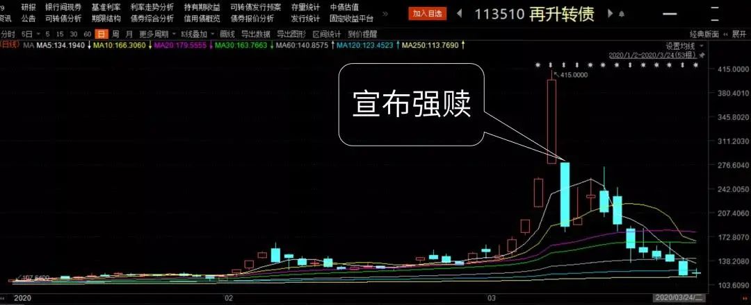 典型例子就是再升转债,3月9日盘中最高成交价415,然后公司宣布强赎,赎回价格是100.459,一刀直接砍掉3/4。下图是再升转债公告强赎后的走势: