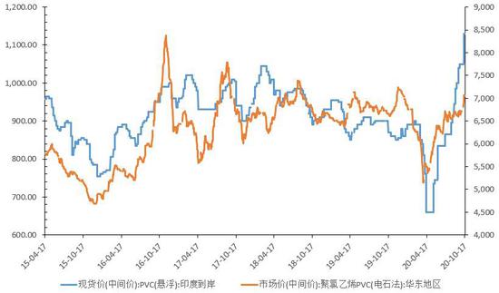 国庆节后,PVC2101期价再创年内新高。节后下游企业纷纷补货,成交氛围较好,部分地区如华南地区存在挺价惜售的行为。国外更是受制于原料的供应中断影响,导致价格涨幅明显超过国内价格,如现货价(中间价):PVC(悬浮):印度到岸已经涨至了5年来的新高。