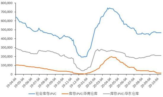 由于春节前下游工厂备货较多加之上游装置基本处于满开工状态,另外,今年受新冠疫情影响,需求不济加之物流受限,多数企业延期复工,社会库存节后继续累库,屡创新高。直到4月初才开始逐步消化。最近3个月,PVC社会库存维持在46万吨左右,处于春节后的低位水平。较往年略微偏高,按照往年规律来看,社会库存在12月中旬前还会有一波去化。