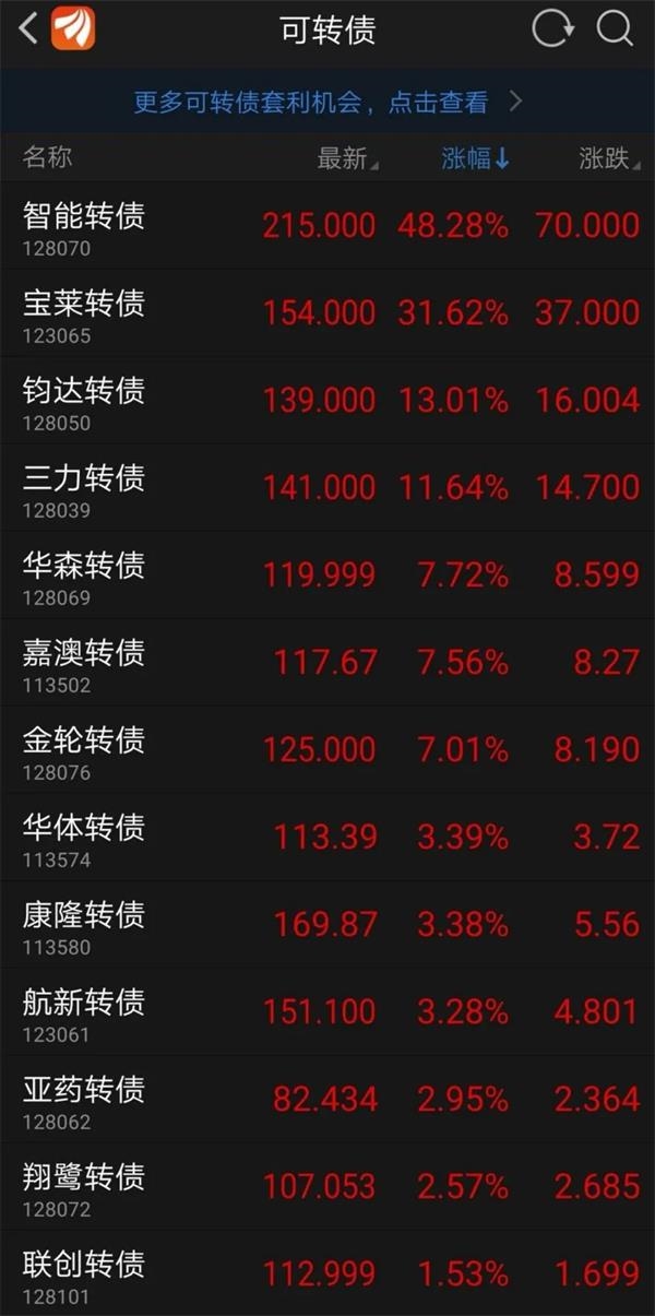 其中,银河转债一度大涨116.91%,尾盘翻绿至下跌3.86%,当日最高价449元每张,收盘时199元每张;智能转债盘中一度涨幅达148.28%,截至收盘,涨幅收窄至48.28%。