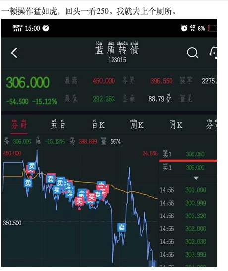 “在蓝盾和模塑亏了好多,大约8万。割了蓝盾后,看着他前几天翻倍,心里不是滋味。昨天鬼使神差,全仓了这个,全赌上了,已经借了20万外债了(补仓的时候借的),支付宝昨天又借了5万多,还有自己的30万,55万全仓。今天拿到尾盘卖了,是因为我想赌到明天,今天就没想卖,不然绝对忍不住卖。结果尾盘涨幅远远超过了预期,我看到80%的时候断定明天还会冲高,就没卖,和朋友吹牛聊天的功夫竟然到了130%,马上又150%,果断收盘前卖了,没有集合竞价出,怕出不掉。今天净赚80万,还完债,这辈子不炒股了。”