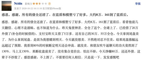 有欢喜的债民发帖表示,净赚80万,所有的债全还清了,这辈子也不炒股了。