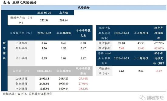 保收益的背后:到底是收益还是风险?其实不用过分悲观。估值整体偏高与利率高位之间的矛盾、估值内部结构分化的矛盾以及各赛道间业绩预期的差距,使得市场近期少了一丝坚定,多了一分疑虑。由此,“保收益”之说成了当前市场的讨论热点。但保收益的背后,是市场出于对风险的规避,而非对收益的确定。我们认为,本周市场对于未来的风险预期已经变得更加确定。市场10月短暂冲高后调整近2周,主要受以下因素影响:(1)流动性方面,10月21日央行行长易纲再提把好货币供应总闸门,随着国内经济修复,宏观流动性收紧预期提升;蚂蚁集团上市在即,2020年IPO规模已达近10年新高,股东减持规模同样较大,加剧微观流动性紧张。(2)海外风险方面,越临近美国大选,不确定性越高,且欧美疫情风险有抬升趋势;同时美股同样持续调整,从海外映射角度压制A股。(3)估值方面,经历2年的反弹,优质标的整体估值不低,市场兑现盈利意愿较高,本周机构重仓股跌幅较大。