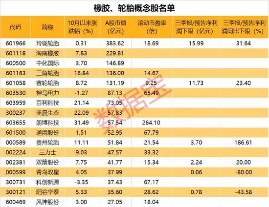 根据证券时报·数据宝统计显示,A股中布局橡胶和轮胎的概念股共有17只。这17只股自10月以来股价平均上涨8.78%,大幅跑赢同期大盘。其中,朗博科技股价10月以来累计上涨31.49%,涨幅居首。公司是一家以橡胶密封件和橡胶制品的生产销售为主体的高新技术企业,公司生产规模和综合实力在细分行业中处于领先地位。美晨生态和百利科技的股价10月以来均上涨超20%。这17只股中,仅有科创新源和神马电力的股价自10月以来累计下跌3.35%和1.27%。