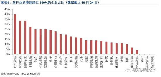 截止10月24日,全部A股中共有628家上市公司公布了2020年三季报,占比为约15.47%,其中同比实现正增长的有397家,占比约为63.22%。其中增长超过100%的有113家,分行业来看,增速超过100%的企业家数,在已公布的企业家数中的占比较高的行业分别是电气设备、农林牧渔、国防军工、非银金融。