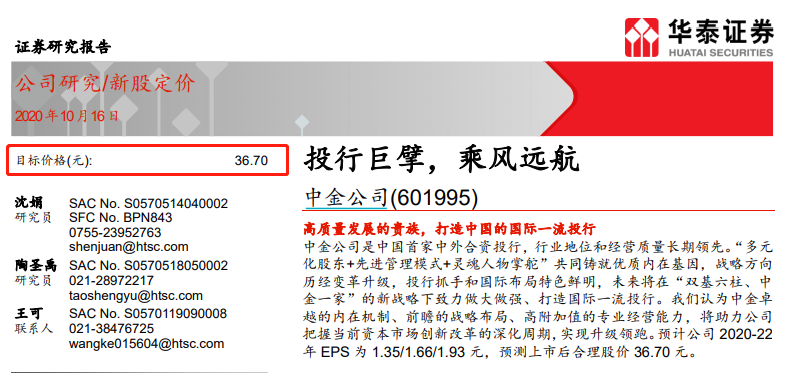 中泰证券陆韵婷(金麒麟分析师)/戴志锋(金麒麟分析师)团队则表示,看好中金未来三年的经营表现;预测中金公2020-2022年归母净利润分别增长67.11%,22.32%和21.80%至70.83亿元,86.64亿元和105.53亿元,首次覆盖给予买入评级。