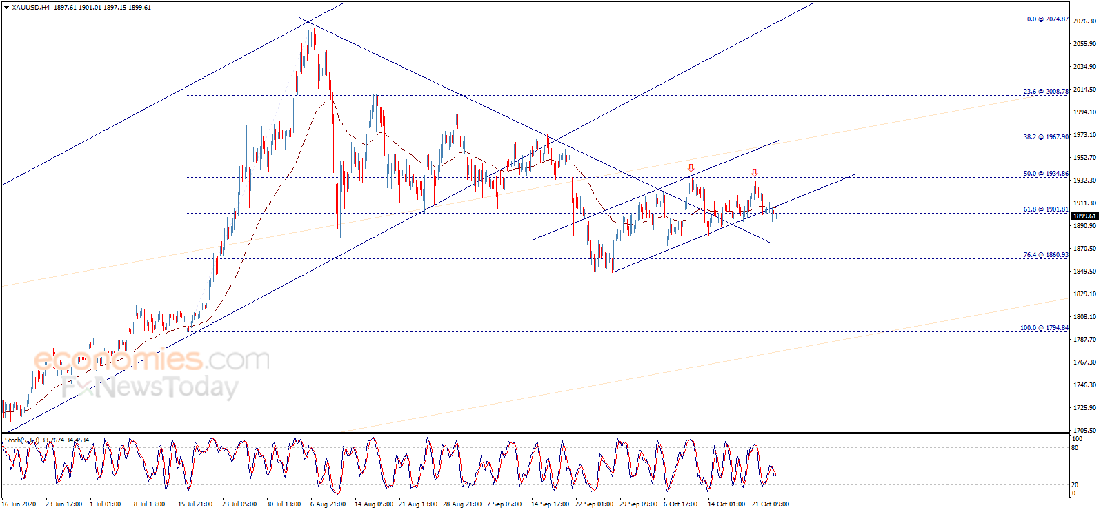 因此,预测金价今日呈看空倾向。从4小时图来看,金价交投在EMA 50指标下方,这支持看空预期。需要指出的是,假如金价突破1901.80-1908.60美元/盎司,这将止住预期中的跌势,并推动金价再度反弹。