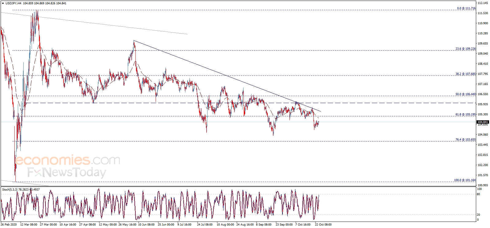美元/日元显现一些轻微的看涨倾向,并接近105.00关口,随机指标再度失去正面动能,而EMA 50指标继续对汇价形成负面压力。