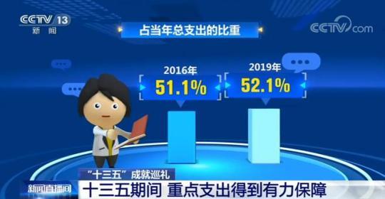 2016-2019年,我国在教育、社会保障和就业、卫生健康、住房保障、节能环保等重点领域上花的钱,从9.6万亿元增加到了12.4万亿元,占当年总支出的比重从51.1%提高到52.1%。保基本、兜底线,“十三五”以来,我国在财政收支平衡压力较大的情况下,确保了基本民生投入只增不减。