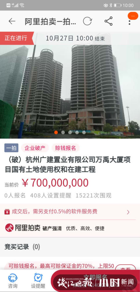 今天,阿里拍卖,“万禹大厦国有土地使用权和在建工程”以7亿元起拍。