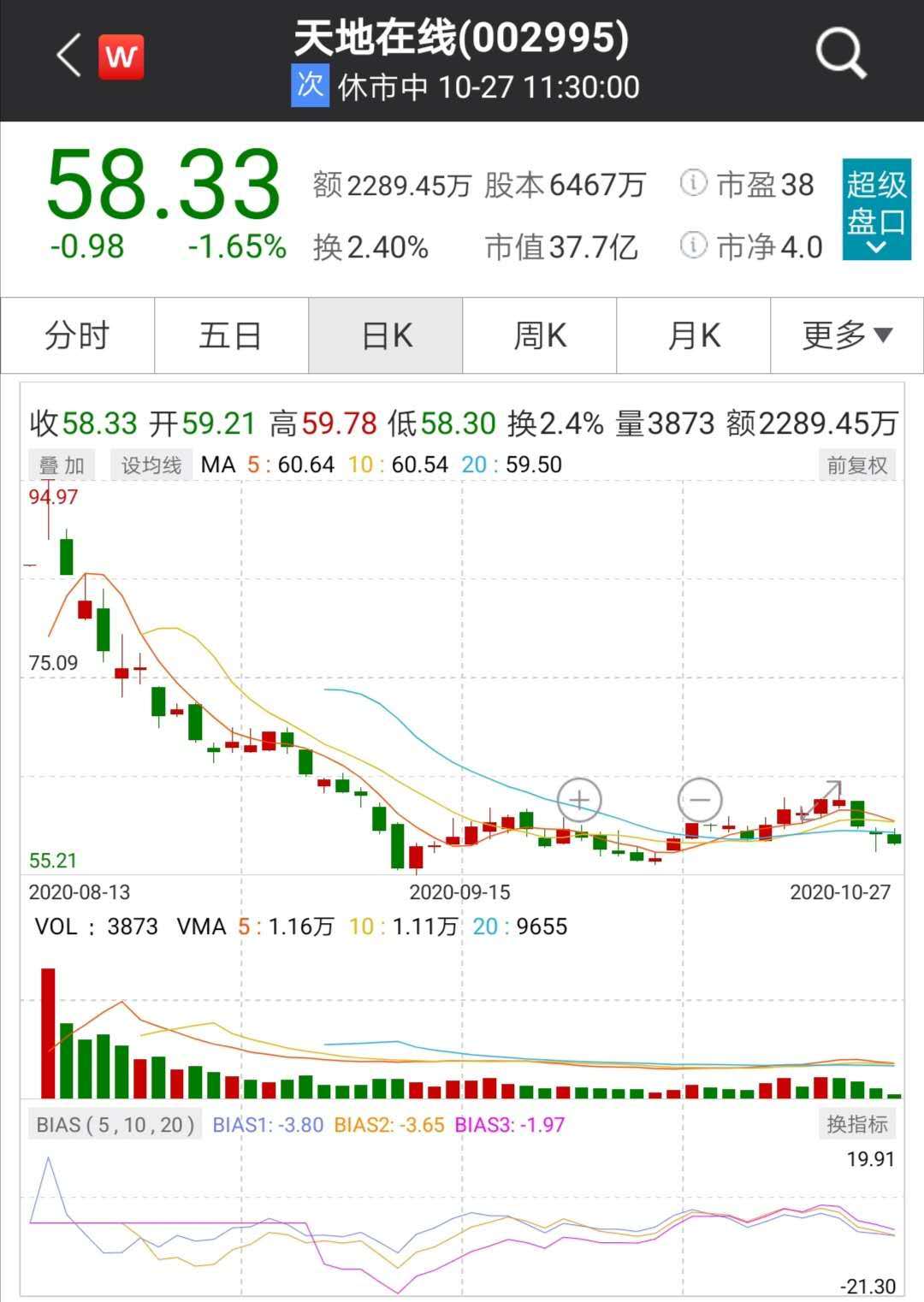 资料显示,天地在线于8月5日在深交所中小企业板上市,发行价格33.84元/股。自首日大涨44%之后,该股又连续拉出7个一字涨停板,最高时股价报94.97元/股。随后便开始一路下行,截至发稿时,天地在线股价报58.33元/股,日内跌幅为1.65%。