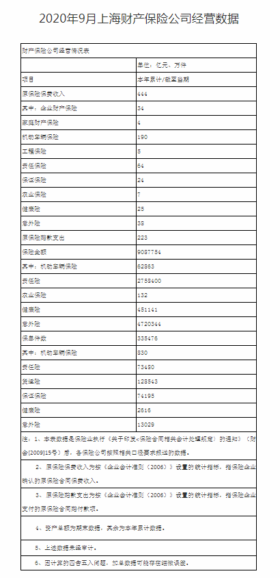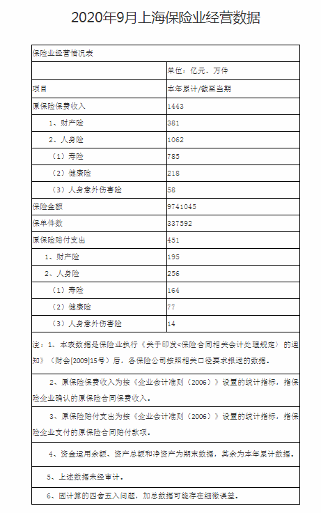 2020年1月至9月,上海辖内保险公司原保险保费收入累计1443亿元,同比增长6.26%;其中产险公司原保险保费收入444亿元,人身险公司原保险保费收入999亿元。